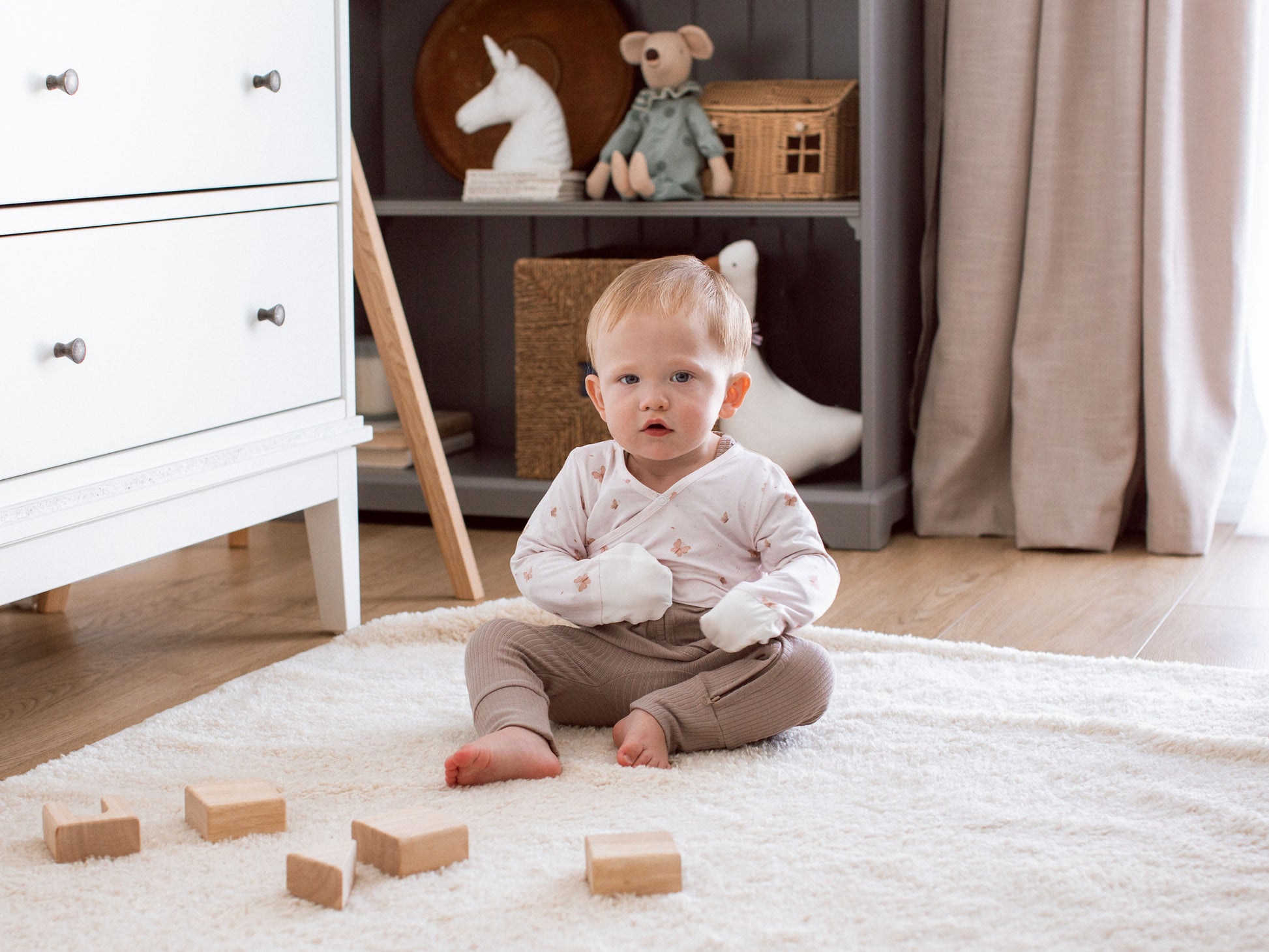 Smooth silk lining at the cuffs prevents further irritation. A gentle barrier between tiny nails and sensitive skin.